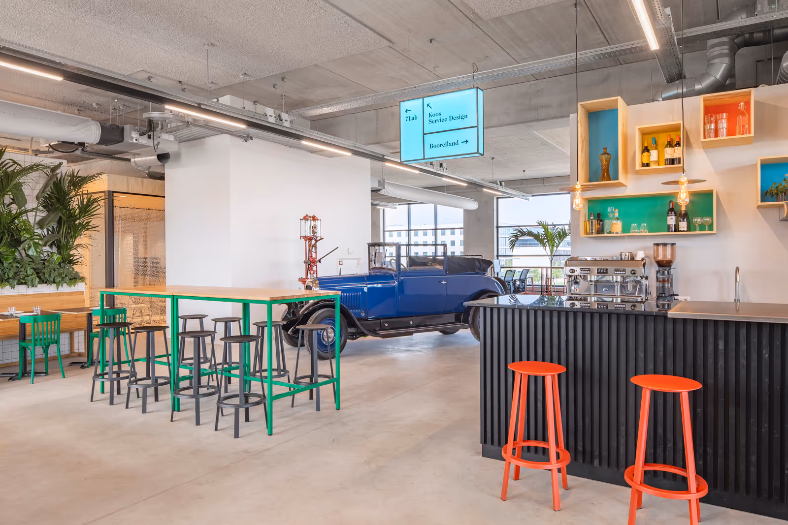 The industrial look of the building, with concrete columns and high ceilings, is softened by wooden elements and green plants that contribute to a pleasant working atmosphere. The different spaces each have their own character and function, from concentrated work to informal meetings. The common areas are designed to stimulate collaboration and creativity.