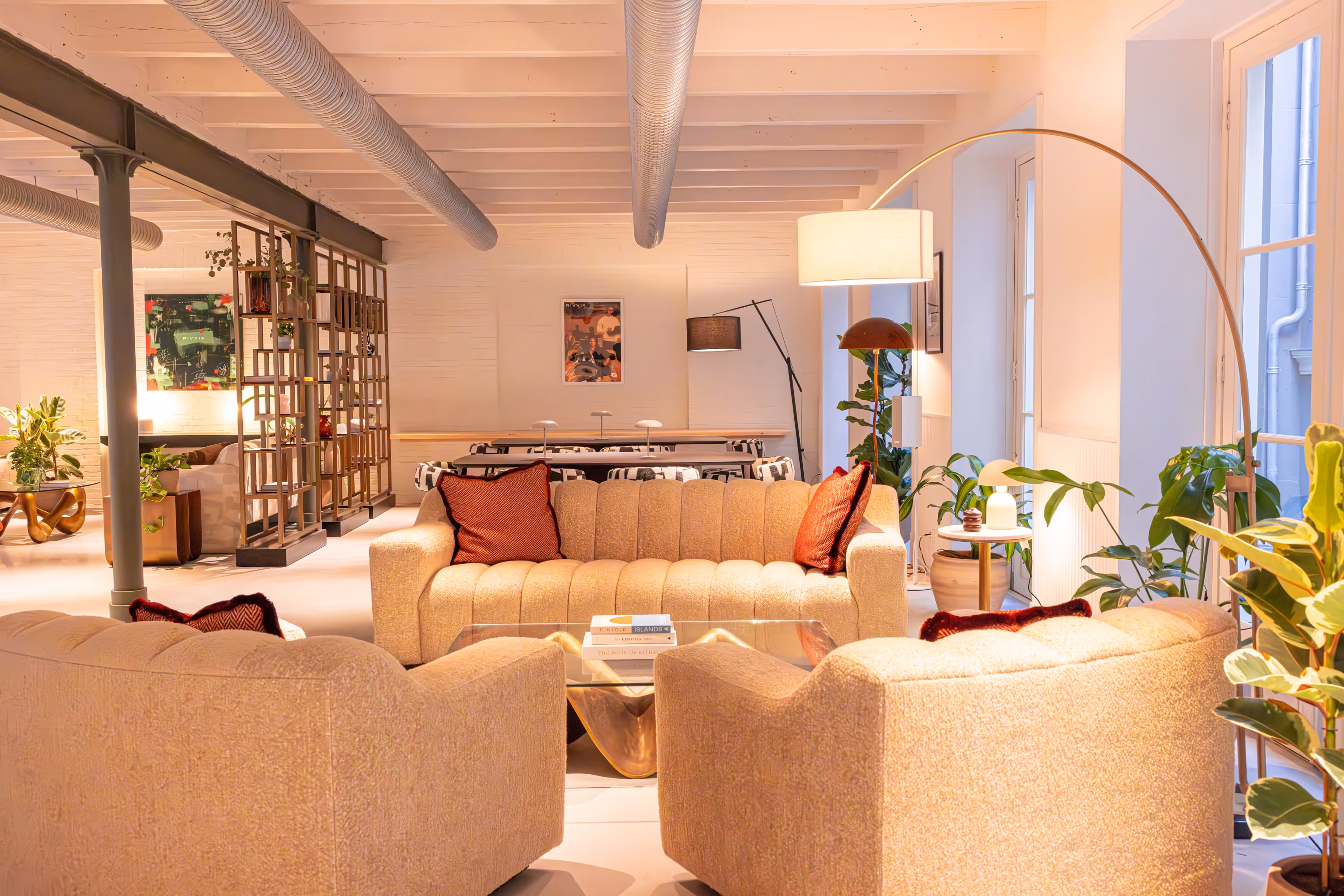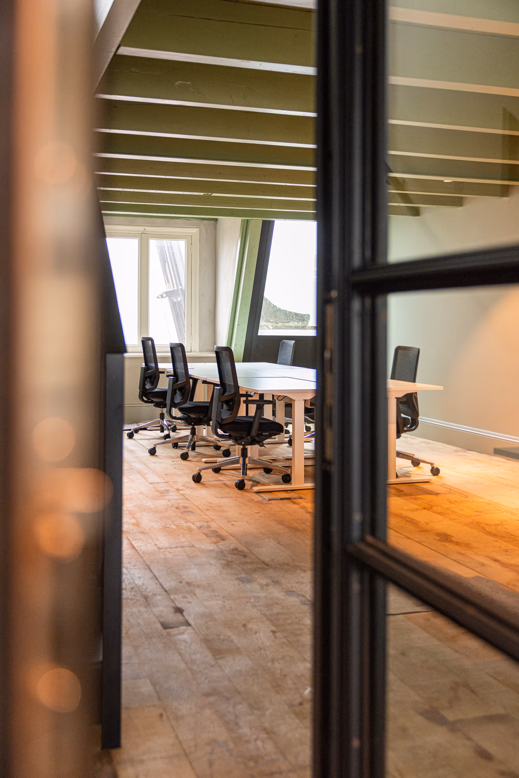 Large windows provide abundant natural light and offer breathtaking views of the canal. The office consists of a mix of private offices and open workspaces, creating a flexible work environment that adapts to different working styles. The decor is warm and inviting, with comfortable workplaces and cozy meeting areas.